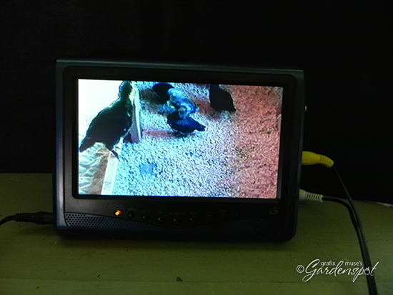I will admit that I was a little nervous for the chicks’ first night out. I placed a thermometer in the window so I can monitor the inside temperature and I kept an eye on them by using a security camera: