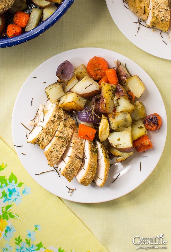 Roasting vegetables is easy. Simply wash, chop into similar-sized pieces, add to a roasting pan, and season with salt, pepper and herbs of your choice. Drizzle the vegetables with some olive oil and toss until they are evenly coated. Spread out the vegetables, cover with foil, and pop it into the oven. This recipe includes lightly breaded chicken. Skip the chicken for a meatless variation.