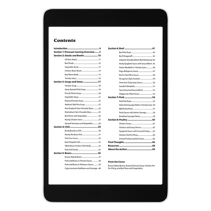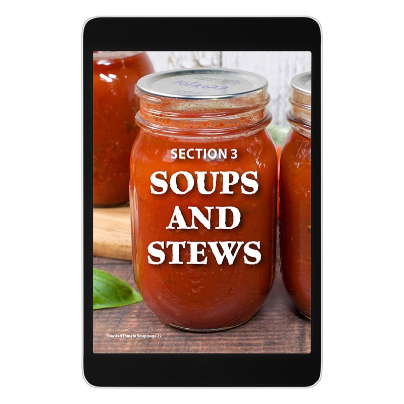 This 70-page eBook is your gateway to a year-round supply of home-cooked meals at your fingertips. Explore a rich collection of safe pressure canning recipes for homemade stocks, bone broths, tomato juice, soups, stews, chilis, beans, beef, pork, and poultry.